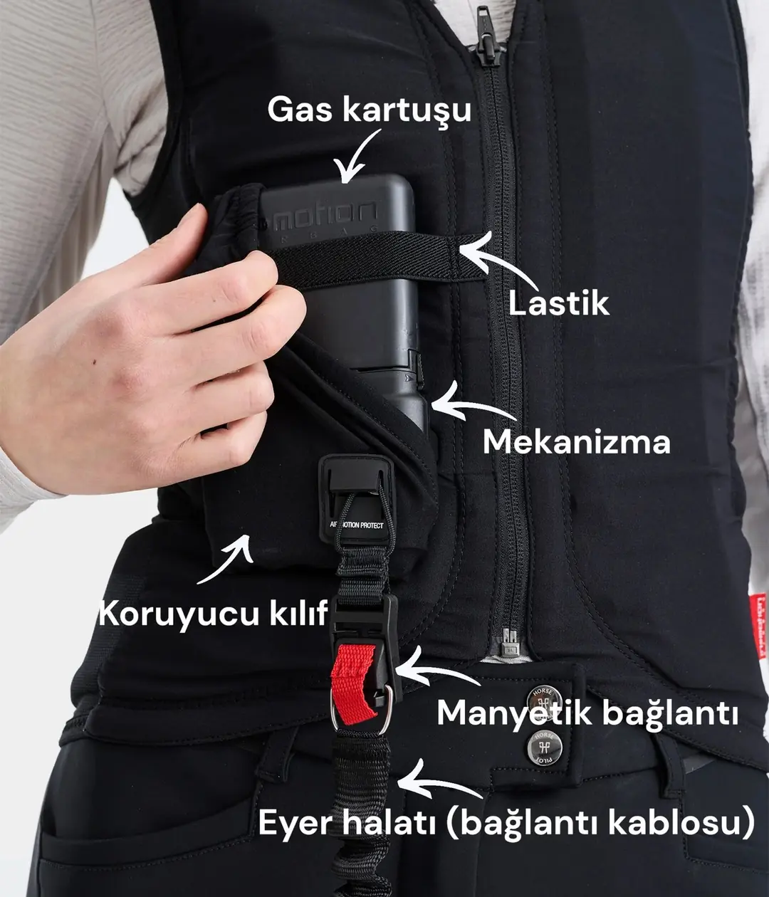 Her yeleğe özel bir pnömatik mekanizma yerleştirilmiştir. Mekanizma üzerinde, tetiklenme sonrası gas kartuşu değişimi için talimat bulunmaktadır.
